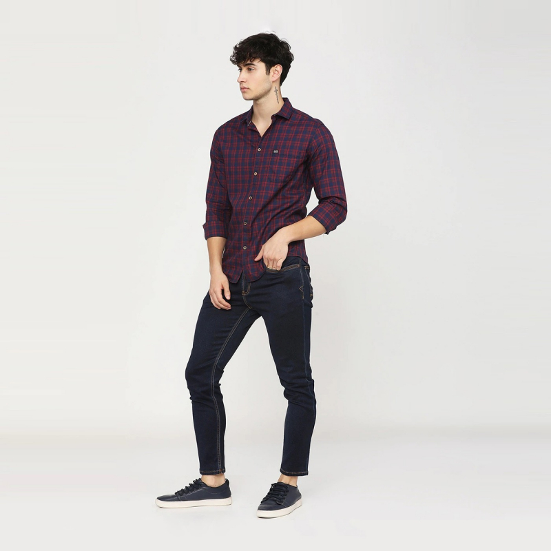 قميص كاجوال باللون الأزرق الداكن والأزرق الداكن، ويحتوي على ياقة واسعة، وأكمام طويلة، وأزرار ضيقة، وحافة منحنية، وجيب 1 رقعة.