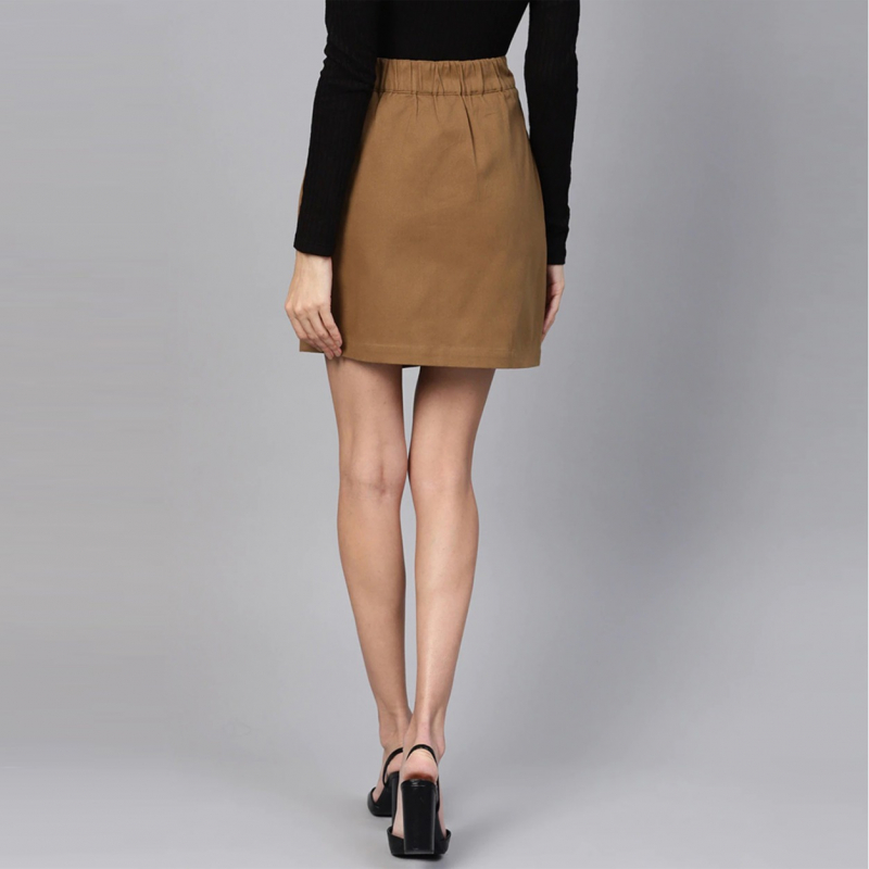 • Brown solid straight skirt, has a partially elasticated waistabnd, button closures, stylised asymmetric hem