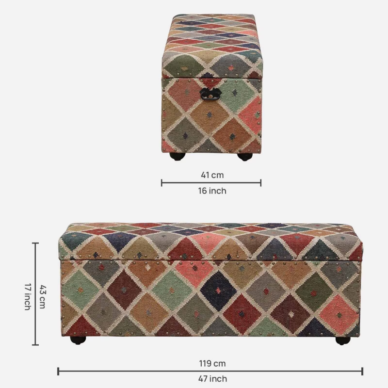 • The " Durees " and " Kilim" used for upholstery are handmade. They may marginally vary in each batch of handweaving/printing. The material used is deliberately hand buffed as a process to give it a rustic appearance.