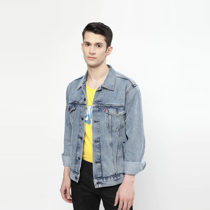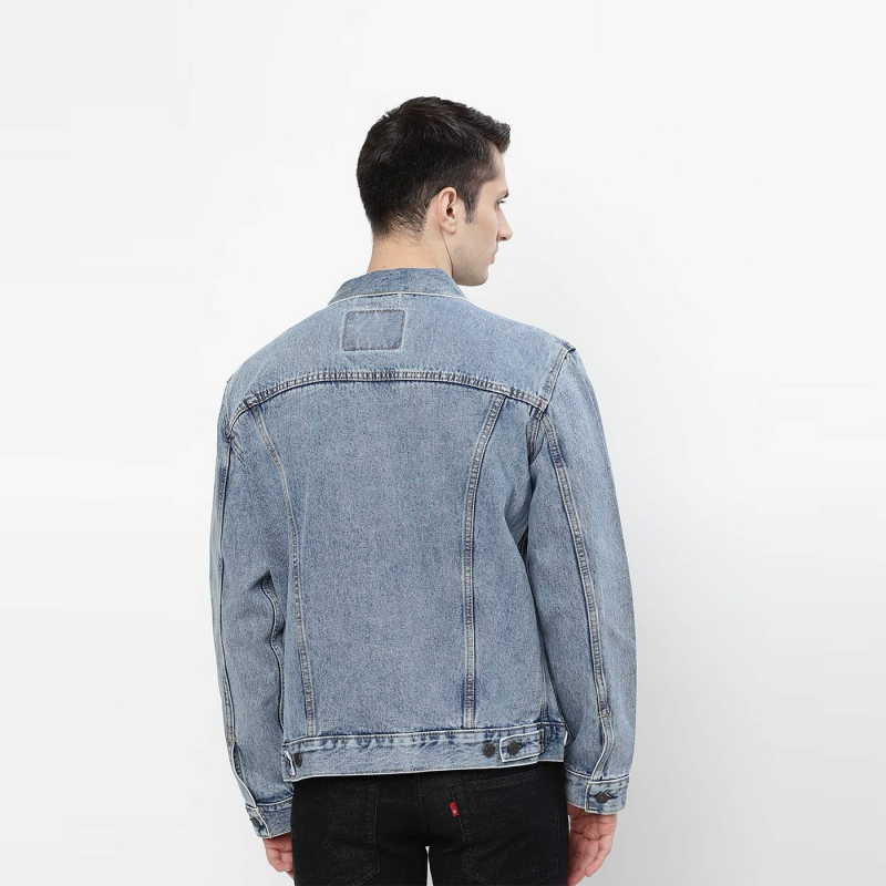 Blue washed waterless denim trucker jacket, has a spread collar, 4 pockets, button closure, long sleeves, straight hem, and cotton lining.