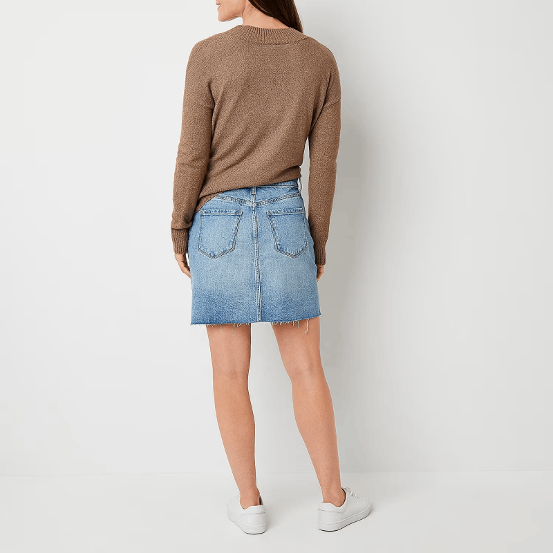 • women's high-rise denim mini skirt with a bit of stretch so you can move throughout your day in comfort and features a classic button-zip fly, belt loops, 5-pocket tailoring, and distressed details for an on-trend appeal.
